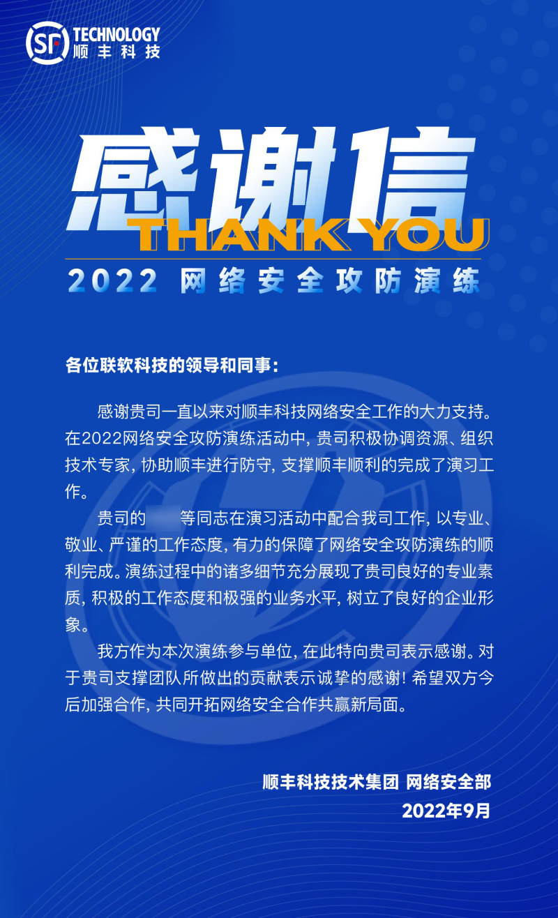 順豐科技在信中表示,我司積極協(xié)調(diào)資源、組織技術(shù)專家,協(xié)助順豐進行防守,支撐順豐順利地完成了演習工作。同時,在信中,順豐科技對我司此次承擔相關(guān)工作的技術(shù)工程師,給予了高度贊揚。