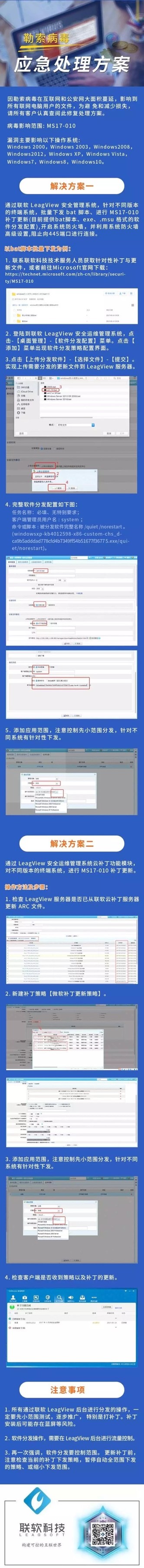 1、請立即通過聯(lián)軟管控中心下發(fā)補丁更新檢查策略,查找所有未修復MS17-010補丁的電腦,一旦發(fā)現(xiàn)有未修復此補丁的電腦,立即通過聯(lián)軟準入控制進行網(wǎng)絡(luò)隔離,并在隔離區(qū)通過補丁管理功能進行補丁分發(fā)。
