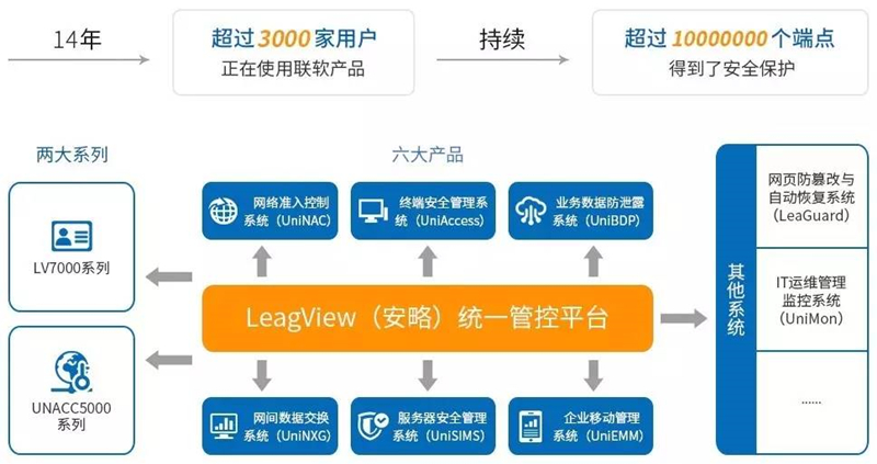聯(lián)軟科技從用戶的實際業(yè)務(wù)場景與網(wǎng)絡(luò)安全防護的前瞻性進行綜合考慮,不斷完善旗下的各產(chǎn)品體系。從網(wǎng)絡(luò)準(zhǔn)入控制、數(shù)據(jù)安全、交互安全、移動安全再到服務(wù)器安全各種企業(yè)用戶的網(wǎng)絡(luò)管理場景。其中自主知識產(chǎn)權(quán)的LeagView系列產(chǎn)品已獲得國家版權(quán)局、公安部、保密局、中國人民解放軍等國家級機構(gòu)的認(rèn)證。以及聯(lián)軟UniNAC產(chǎn)品已經(jīng)成為全球領(lǐng)先的網(wǎng)絡(luò)準(zhǔn)入控制產(chǎn)品,為國內(nèi)數(shù)量眾多的高端用戶所選擇。