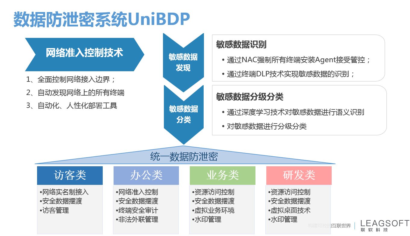 目前,國(guó)內(nèi)的多數(shù)行業(yè)已經(jīng)意識(shí)到內(nèi)部威脅及第三方人員的數(shù)據(jù)泄露風(fēng)險(xiǎn),會(huì)主動(dòng)尋求技術(shù)手段或者專(zhuān)業(yè)的安全廠商進(jìn)行風(fēng)險(xiǎn)規(guī)避。而聯(lián)軟科技正是一家擁有豐富企業(yè)內(nèi)網(wǎng)安全建設(shè)的廠商,在提出構(gòu)建平臺(tái)化的統(tǒng)一安全管控體系之初,就將企業(yè)數(shù)據(jù)保護(hù)尤其是涉及到企業(yè)敏感信息諸如商業(yè)秘密之類(lèi)的保護(hù)等納入了產(chǎn)品規(guī)劃當(dāng)中。目前,聯(lián)軟的業(yè)務(wù)數(shù)據(jù)防泄露系統(tǒng)(UniBDP)經(jīng)過(guò)多年的經(jīng)驗(yàn)積累,已經(jīng)發(fā)展為一套成體系的業(yè)務(wù)系統(tǒng)信息防泄露的成熟解決方案。