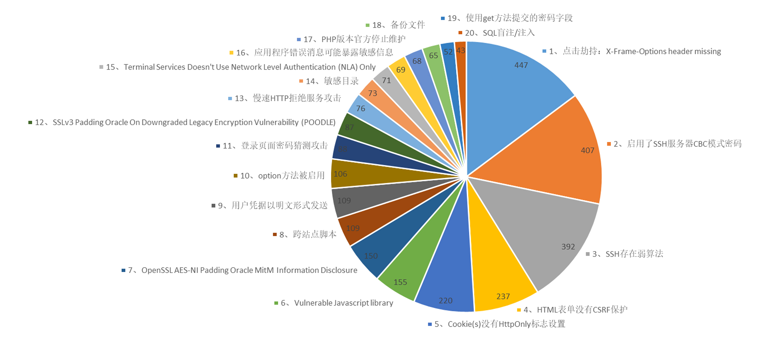 從抽樣監(jiān)測(cè)分析的結(jié)果來(lái)看,目前互聯(lián)網(wǎng)金融行業(yè)的網(wǎng)絡(luò)安全情況不甚樂(lè)觀,存在的風(fēng)險(xiǎn)較高,其中,跨站腳本、PHP版本官方不提供安全補(bǔ)丁和SQL注入為TOP3高危漏洞。對(duì)于中低危漏洞,經(jīng)統(tǒng)計(jì),點(diǎn)擊劫持漏洞占整個(gè)web漏洞數(shù)量約8.5%,即用戶在不知情的情況下被偽裝的按鈕挾持,極易誘發(fā)財(cái)產(chǎn)流失。部分企業(yè)的安全防護(hù)意識(shí)和投入不足,對(duì)安全漏洞可能帶來(lái)的風(fēng)險(xiǎn)認(rèn)識(shí)不到位。