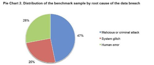 報(bào)告顯示,數(shù)據(jù)泄露事件的主要根源中,47%的事件涉及惡意或犯罪行為,25%是由于員工或承包商疏忽(人為因素),28%涉及系統(tǒng)故障,包括IT和業(yè)務(wù)流程故障。