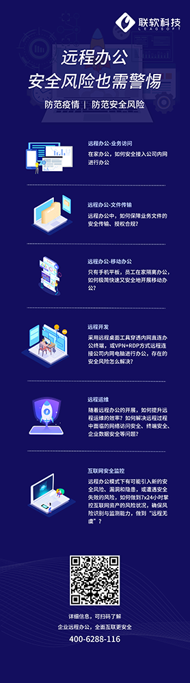 疫情期間,聯(lián)軟為您解決多種遠(yuǎn)程辦公安全問題,保障企業(yè)業(yè)務(wù)順利進(jìn)行,有需求的企業(yè)用戶可掃描下方二維碼直接申請?jiān)囉?,或撥?00-6288-116咨詢,聯(lián)軟網(wǎng)絡(luò)安全專家為您服務(wù)!