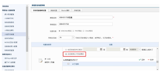 部署聯(lián)軟UniNAC網(wǎng)絡(luò)準入控制系統(tǒng)的用戶,針對此次漏洞,可在入網(wǎng)安全檢查規(guī)則中,增加對KB4551762的檢查,且要求更新安裝指定補丁后才允許入網(wǎng),在網(wǎng)絡(luò)邊界構(gòu)筑安全防護。